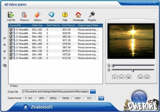 Zealot All Video Joiner поможет вам собрать несколько коротких видеофайлов в один большой. Программа может работать со следующими форматами файлов: AVI, DivX, MPEG, WMV, ASF. Интересной особенностью является возможность сборки видео, закодированных разными форматами.