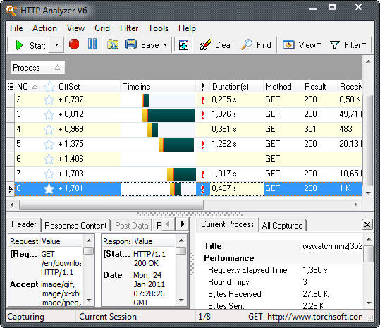 HTTP Analyzer – программа-сниффер, позволяющая вам производить мониторинг и захватывать HTTP/HTTPS трафик в реальном времени. Позволяет отслеживать и отображать широкий диапазон информации, включая заголовки, содержание, cookies, строки запросов, отправку данных, потоки запросов и ответов, перенаправление URL и многое другое. Программа дает возможность удобно просматривать потоковые запросы. Кроме этого, данная программа обеспечивает кэширование информации и очистку сессии, информацию о статусе HTTP кода и имеет несколько настроек по фильтрации. Программа доступна в двух версиях, в качестве отдельного полнофункционального приложения и в качестве дополнения для Internet Explorer. Кроме IE, программа поддерживает работу с браузерами Opera, Firefox и другими интернет-браузерами. Основные возможности программы сводятся к удобной отладке HTTP-запросов.