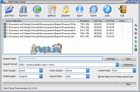 Allok Video Joiner - программа для создания одного большого медиа файла состоящего из AVI, Divx, XviD, MPEG I/II, VOB, DAT, ASF, WMV фрагментов. Позволяет соединять неограниченное количество видео файлов, сортировать последовательность фрагментов, добавлять к уже существующему проекту отрывки, сохранение проекта в AVI, MPEG, WMV, ASF форматах, встроенный проигрыватель поможет осуществить предварительный просмотр выбранного момента или просмотреть часть проекта. Программа проста в обращении, для получения конечного результата необходимо лишь несколько щелчков мышки, высокая скорость соединения без потери качества.