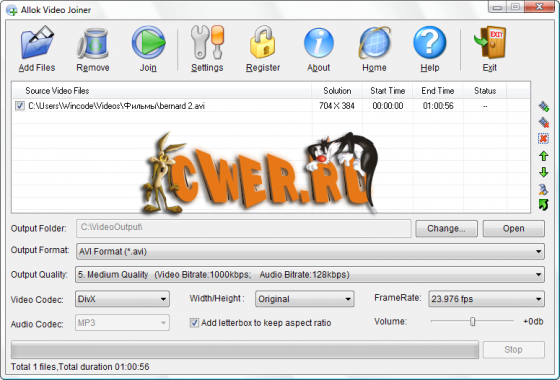 Allok Video Joiner - программа для создания одного большого медиа файла состоящего из AVI, Divx, XviD, MPEG I/II, VOB, DAT, ASF, WMV фрагментов. Позволяет соединять неограниченное количество видео файлов, сортировать последовательность фрагментов, добавлять к уже существующему проекту отрывки, сохранение проекта в AVI, MPEG, WMV, ASF форматах, встроенный проигрыватель поможет осуществить предварительный просмотр выбранного момента или просмотреть часть проекта. Программа проста в обращении, для получения конечного результата необходимо лишь несколько щелчков мышки, высокая скорость соединения без потери качества.