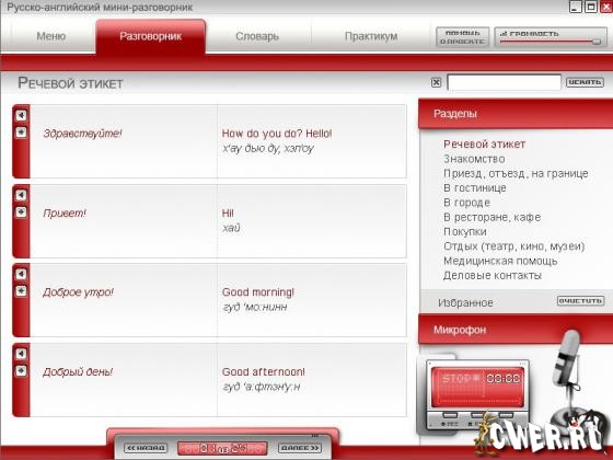 Компания «Новый Диск» представляет серию разговорников «Путешествие без проблем!» – практические электронные пособия, предназначенные для использования на персональном компьютере и MP3-плеере. Английский язык по праву считается языком международного общения. На экскурсии по Великобритании или европейским странам, на стажировке в США или в командировке в Австралию – везде понадобится знание английского языка. Освоить базовую лексику и преодолеть языковой барьер поможет «Русско-английский мини-разговорник». Около 1 520 озвученных фраз и слов, содержащихся в нем, помогут объясниться в самых распространенных и типичных ситуациях: в самолете и поезде, на границе, в гостинице, ресторане, магазине и т. д. Есть возможность прослушать звучание фраз, сравнить свое произношение с эталоном и сформировать собственный рабочий словарь самых нужных выражений.