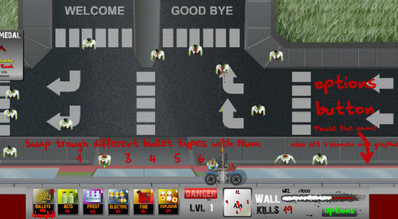 Продержись в городе 24 дня, отстреливаясь от наступающих зомби. В вашем распоряжении тележка с установленным пулеметом, огнеметом, заморозкой и кислотной пушкой.