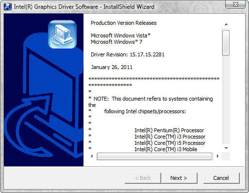 Корпорация Intel представила новую версию драйвера под названием Intel Graphics Media Accelerator для семейства операционных системы Windows Vista и Windows 7. Датируется 21-м января 2011 года, предназначен для ОС архитектуры x86 и x64.