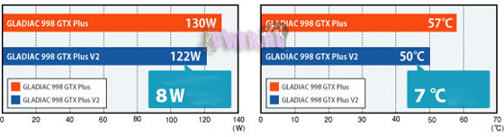Как заявляют разработчики, их детище под названием ELSA GLADIAC 998 GTX Plus V2 по своей длине короче эталонного образца на 38 мм, а установленный на ускорителе двухслотовый кулер с более крупным вентилятором понижает температуру на 7 градусов по шкале Цельсия эффективнее, чем это делает референсная система охлаждения. Кроме того, отмечается, что для организации дополнительного питания в данной модели предусмотрен всего один 6-контактный разъём, что, согласитесь, тоже приятно.