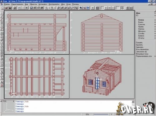 2. Возможности: выбор формы и размеров сечения бревна, построение и перемещение стен, балок, столбов, установка окон, дверей, проемов различной формы, выбор типа подрезки торцов бревен