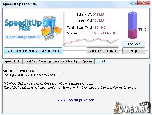 SpeedItUp Free увеличит скорость работы системы, работающей под Windows XP или Microsoft Windows Vista. Использует технологию оптимизации Работы Жесткого Диска, которая позволяет считывать данные почти в 3 раза быстрее. SpeedItup Free также оптимизирует работу RAM позволяет поменять настройки так, что увеличится скорость Интернет соединения и производительность компьютера в общем.