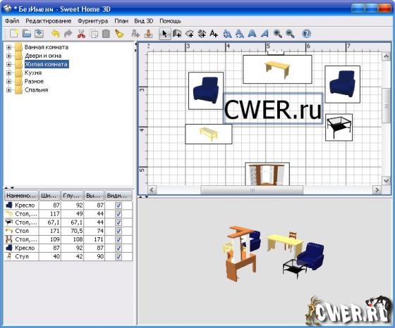 Sweet Home 3D - бесплатная программа для помощи в оформлении дизайна жилых помещений и проектирования интерьеров, не требующая специальных навыков. С ее помощью можно создать 2D план настоящего помещения или квартиры, разместить на нем окна, двери и мебель а затем увидеть как все это будет выглядеть в интерактивном 3D. (Интерактивным - в смысле что 3D моделью можно покрутить в разные стороны и приблизить-удалить камеру.)