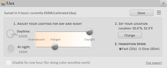 Программа, изменяющая цветовой профиль вашего монитора в зависимости от времени суток, которую можно бесплатно скачать на cwer.ws. Собственно, этим все сказано. Ночью глаза меньше устают от теплых цветовых тонов, днем — от ярких и холодных. На этом и основана программа. Существует возможность указания своих координат для правильной смены цветового профиля.