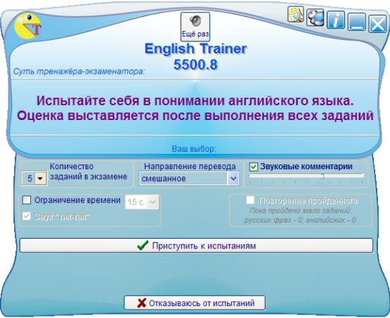 English Trainer - тренажер-экзаменатор профессиональных переводчиков. Для тех, кто думает, что знает английский. Предлагает задания профессиональной сложности на перевод фраз. Выставляет оценку. Номер версии программы соответствует количеству имеющихся в ней заданий.