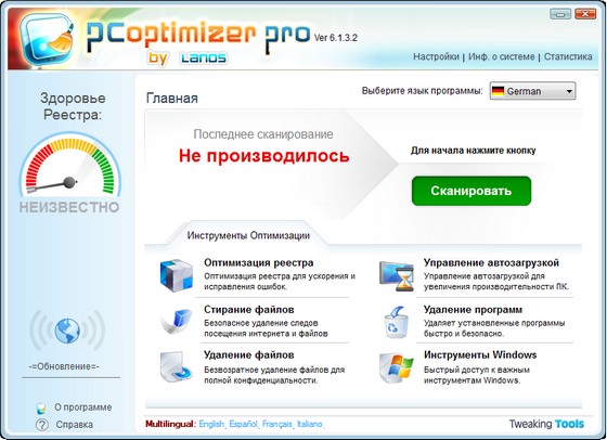 PC Optimizer Pro - программа для очистки, восстановления и оптимизации операционной системы Windows в несколько кликов мышью. Программа позволяет оптимизировать производительность вашего компьютера, заставляя ваш компьютер работать быстрее, и позволяет исправлять различные ошибки системы, предотвращая до 90% всех сбоев в работе компьютера. Программа состоит из набора системных утилит, которые помогут вам очистить системный реестр и жесткий диск от мусора, удалить ненужные приложения и программы из автозапуска, покажет вам информацию о вашей системе, а также сделает резервную копию на случай сбоя в системе и множество других операций.