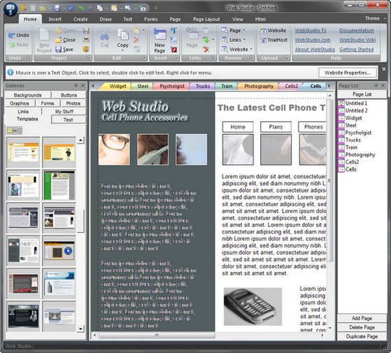 Web Studio - программа для создания веб - сайтов. Данная программа имеет все необходимое для создания сайта. Галерея изображений, кнопок, цветовых схем и других графических элементов, которые можно использовать для разработки веб - страниц. Вы также можете использовать собственные графические элементы дизайна. WYSIWYG интерфейс программы делает ее легким в использовании, и позволяет создать сайт профессионального качества. HTML редактор позволяет добавлять ваш собственный HTML код, а также изменять HTML объекты и страницы вашего сайта.